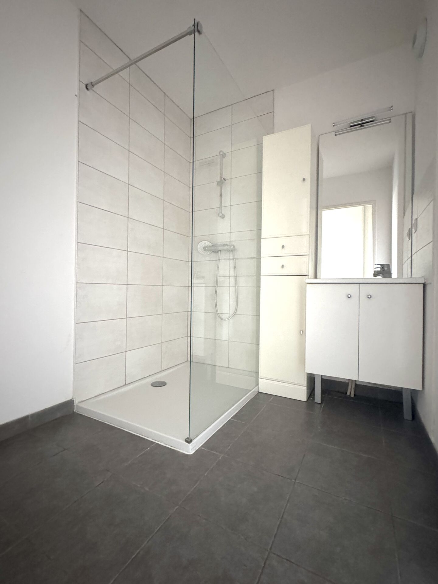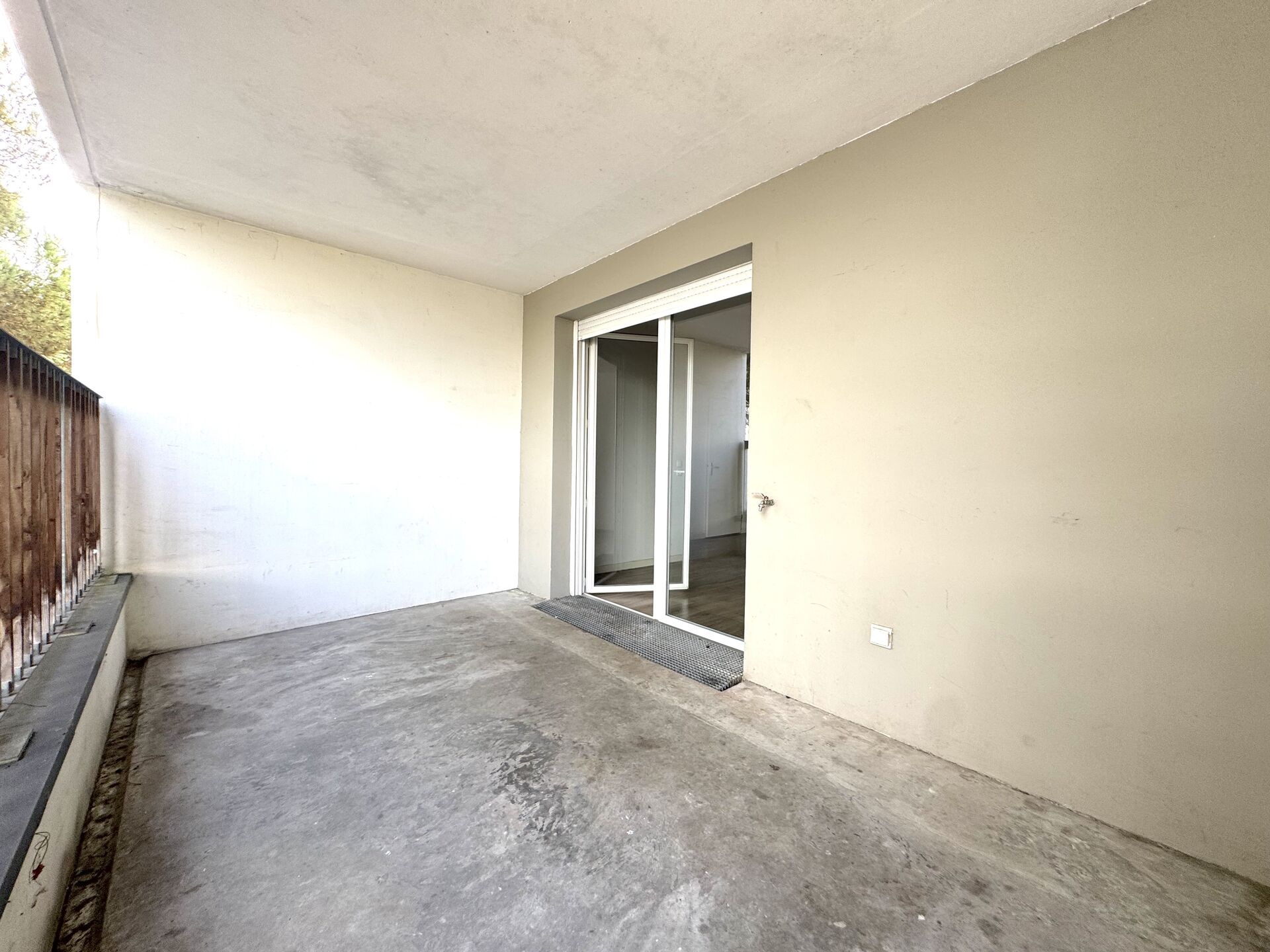 Il se compose ainsi : une grande entrée desservant en premier lieu la salle d'eau, des WC séparés, une grande chambre avec placards et enfin le séjour/cuisine ouvrant sur une loggia d'environ 10m2.